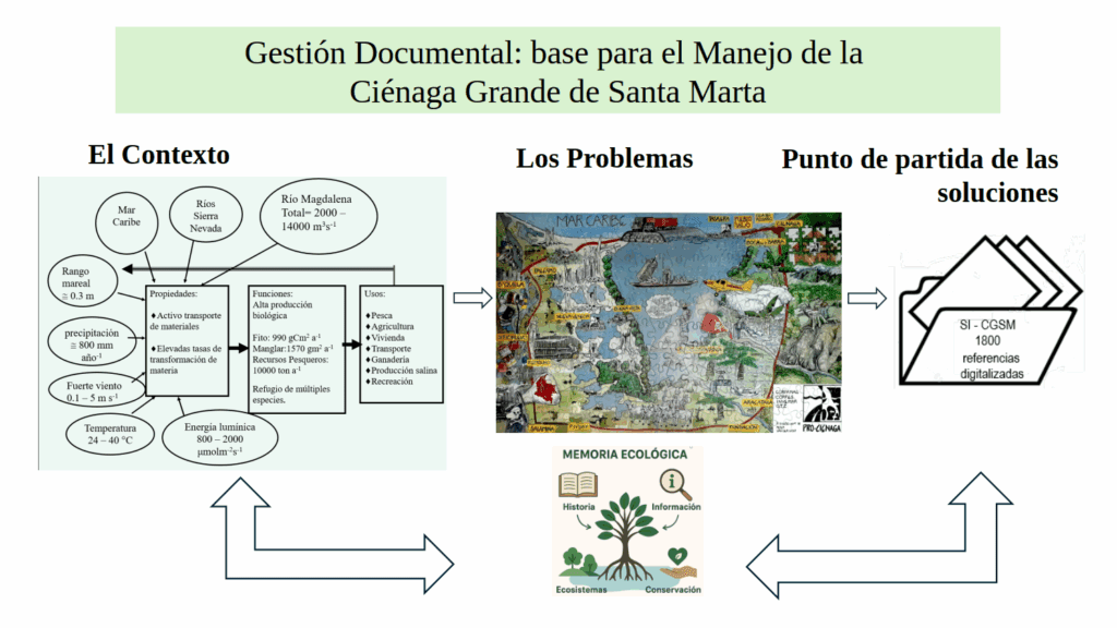 La Ciénaga Grande de Santa Marta (CGSM) es uno de los sistemas socioecológicos más estudiados de Colombia y, a la vez, uno de los más amenazados. Su deterioro se ha intensificado desde los años sesenta por intervenciones de infraestructura que alteraron su conectividad hídrica. A pesar de múltiples esfuerzos de restauración, como el Proyecto Pro-Ciénaga, la falta de continuidad en la gestión y el desconocimiento de información técnica acumulada han limitado la efectividad de las intervenciones. Este artículo presenta un repositorio documental sistematizado con más de 1800 referencias sobre la CGSM, disponible en línea a través del portal del CEMarin. La colección incluye informes técnicos, tesis y artículos científicos de difícil acceso, recuperados de archivos institucionales y personales. La plataforma no solo facilita el acceso a documentos históricos, sino que también los categoriza por dimensiones abióticas, bióticas y antrópicas, integrando herramientas de navegación modernas y enlaces a copias digitales. Se propone que el uso estratégico de esta información histórica es esencial para una gestión ambiental más eficaz, proactiva y sostenible. En lugar de priorizar la generación constante de nuevos datos, se aboga por integrar la “memoria ecológica” en la toma de decisiones actuales. Este artículo invita a reflexionar sobre el valor del conocimiento acumulado como base para mejorar la relación costo-beneficio, evitar errores repetitivos y fortalecer las acciones de conservación en la CGSM. La pregunta que se aborda es: ¿Cuál es el alcance, calidad y disponibilidad de la información para la gestión ambiental en la CGSM?